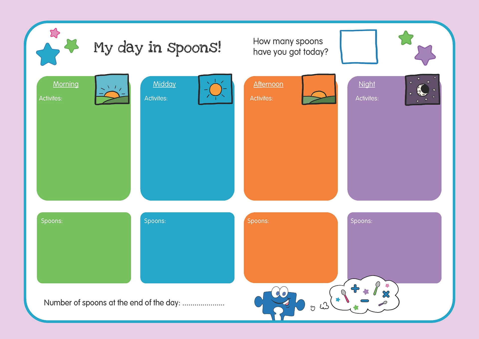 A progress chart I designed to help the young members of the charity track their energy levels throughout the day, using the spoon method.